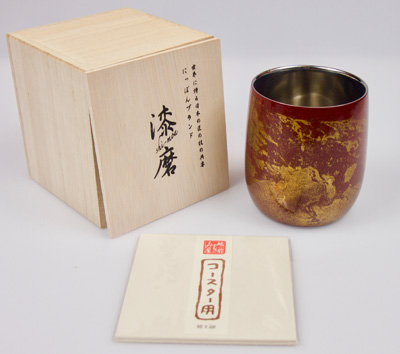 最高のステンレスの内面を磨き込みによりクリーミーな泡が立ち、外面には耐水性、耐熱性、防腐性に優れた漆を塗り、流れ文様が浮き出てくる白檀仕上げになっております。二重構造により、冷たいもの暖かいものを快適に提供→保温+手に熱すぎず冷たすぎない。74φx85h(mm) 250ml