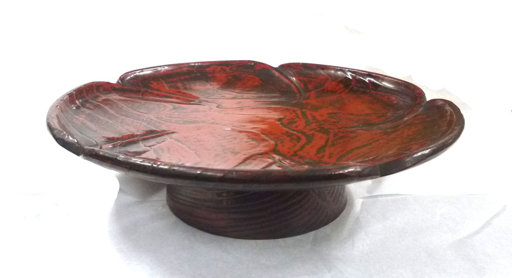 くりぬき仕上げの木製漆塗の捻り梅彫の高坏