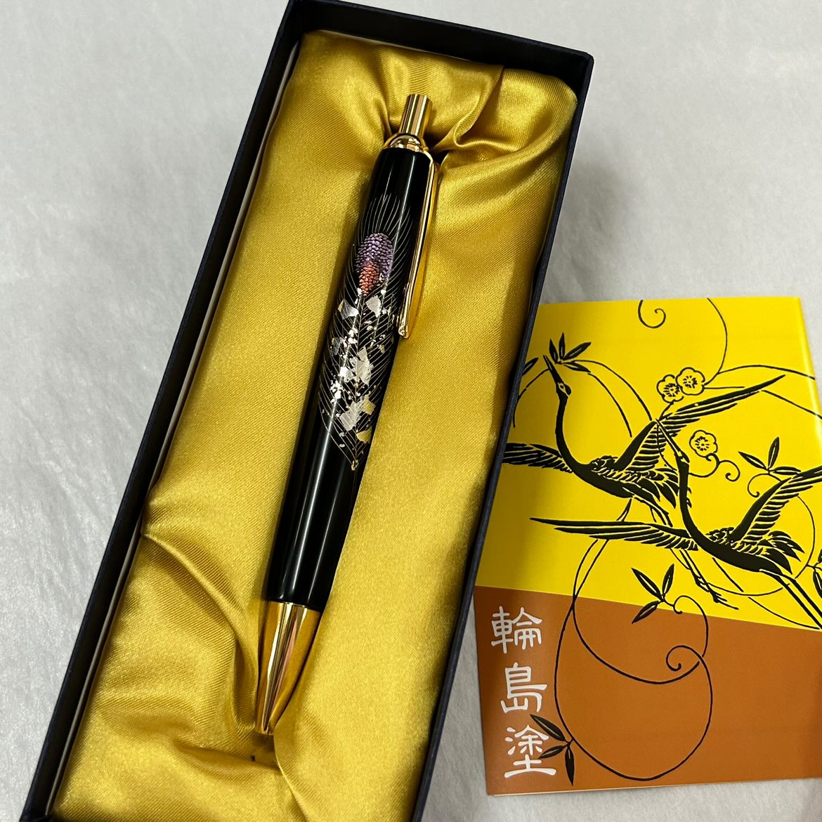 輪島塗漆芸作家がボールペンに漆で羽の模様を描き、金粉等を蒔いて作ったものです。お世話になった上司や、海外の方へのプレゼントに好適です。インクは黒色で、交換式です。