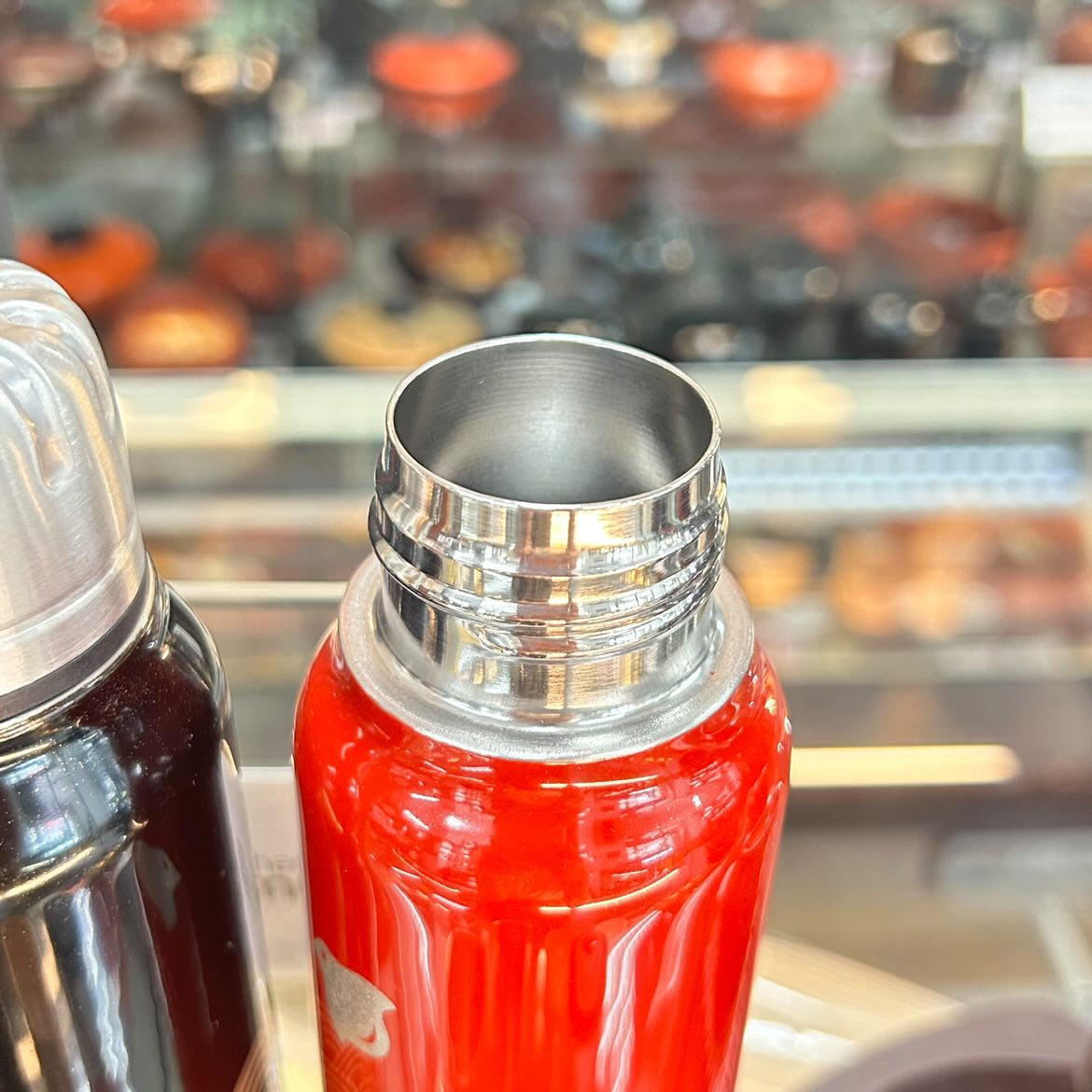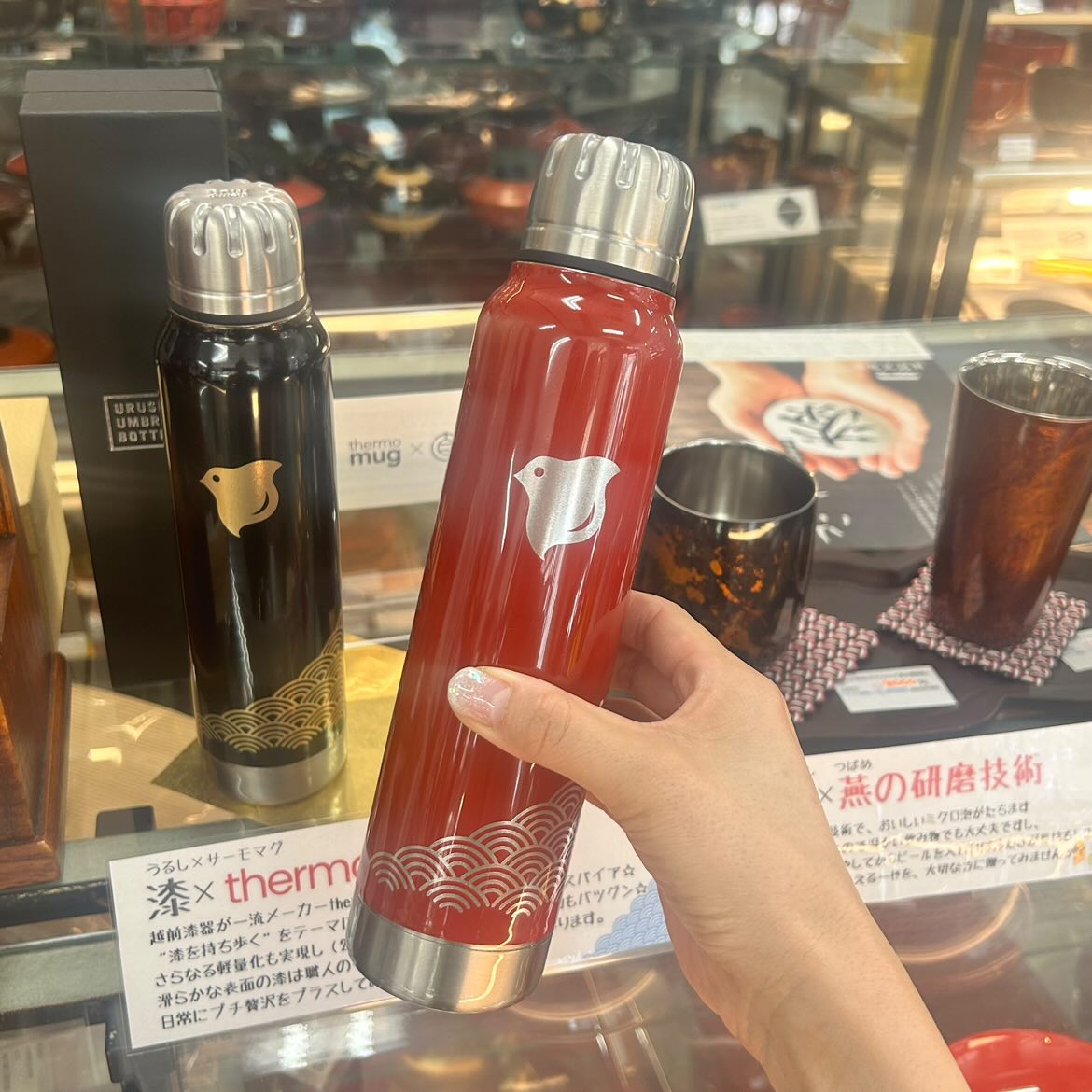 越前漆器とthermo mugのコラボ商品です。持ち運びやすさを追求し、折畳み傘に似た形状にして従来品より軽量化しています。朱色と黒色は漆の手塗りで、縁起の良い和柄が施されています。箱入りで贈呈品にも好適です。