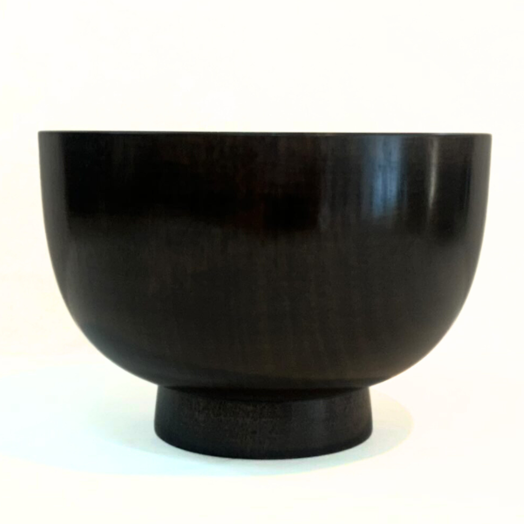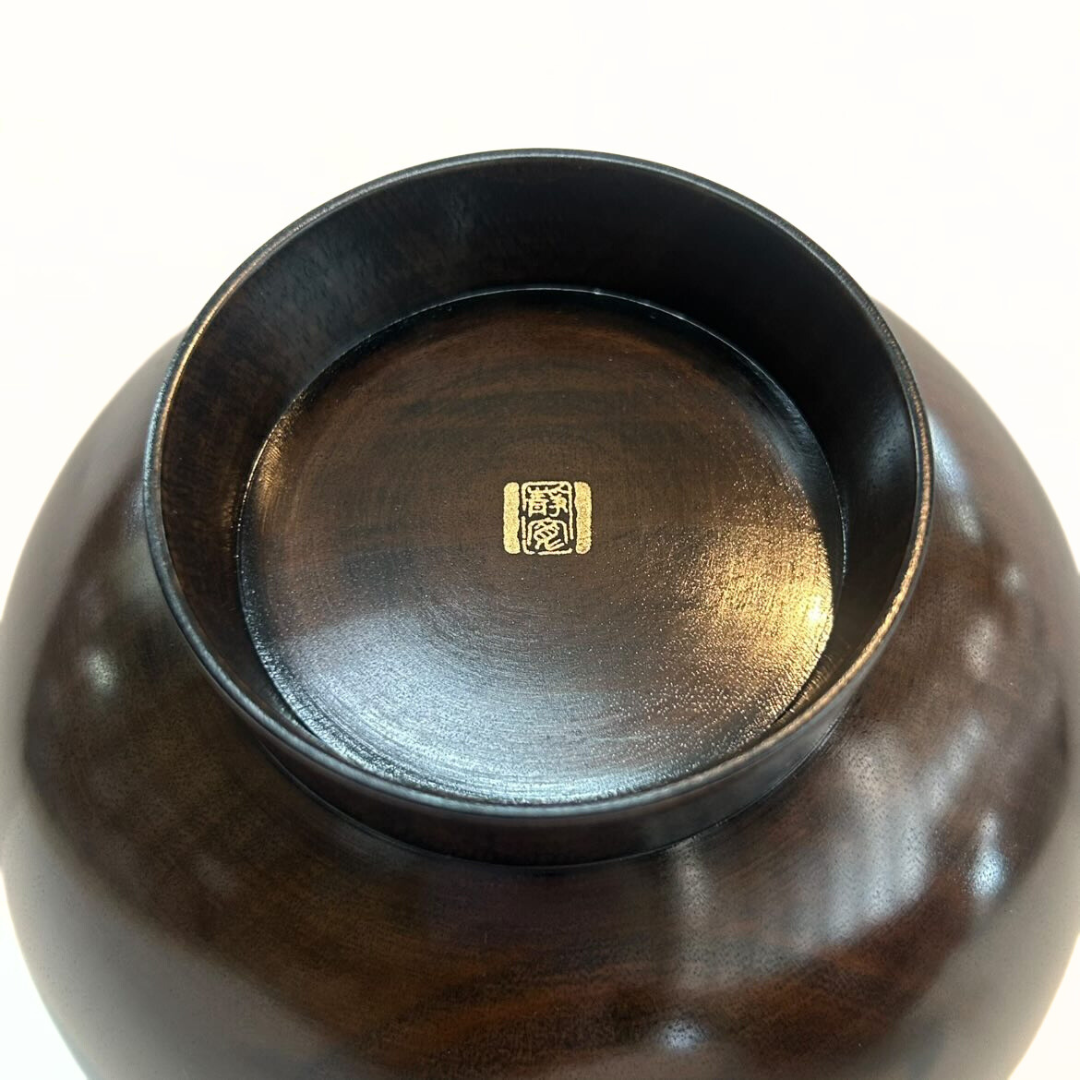 木地、塗すべて国産手作りの木製漆塗で安心、伝統の薄挽きで木目が墨黒に見事に調和しています サイズ:直径13.6cm×高さ8.7cm